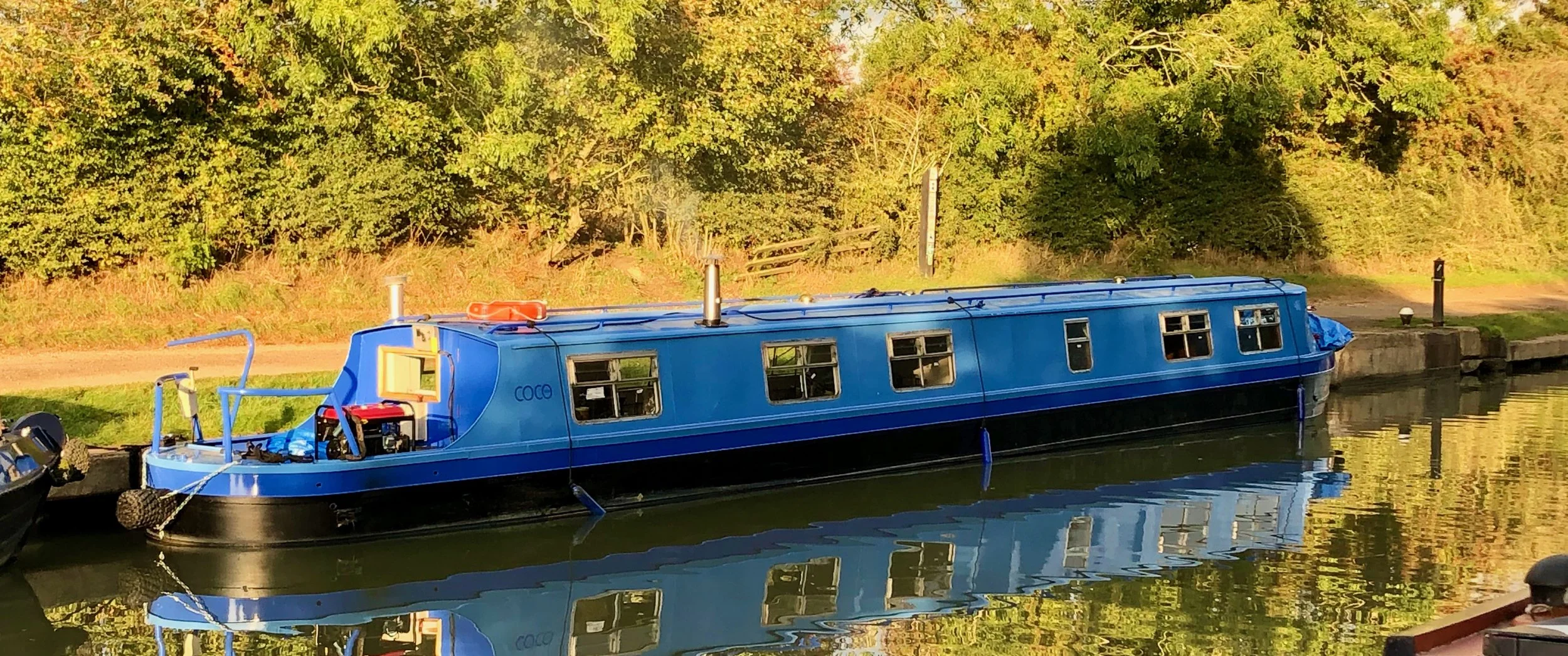 Wm. Morris, as adapted. To which I’d add: here is no need for decoration; decoration is not design. This is often misunderstood in the English culture (culture being the learned behaviour that encodes an intergenerational process, AKA humanity’s persistence). The boat shown here follows this dictum and is unusual in that the majority of modern narrowboats are painted to ape a long-gone era when canals had a working life; boats had stripes, decorations and other designs to signify ownership and operation. The two blues I have chosen are by Designers Guild; SAINTE CHAPELLE NO. 54 and PRUSSIAN BLUE NO. 52.