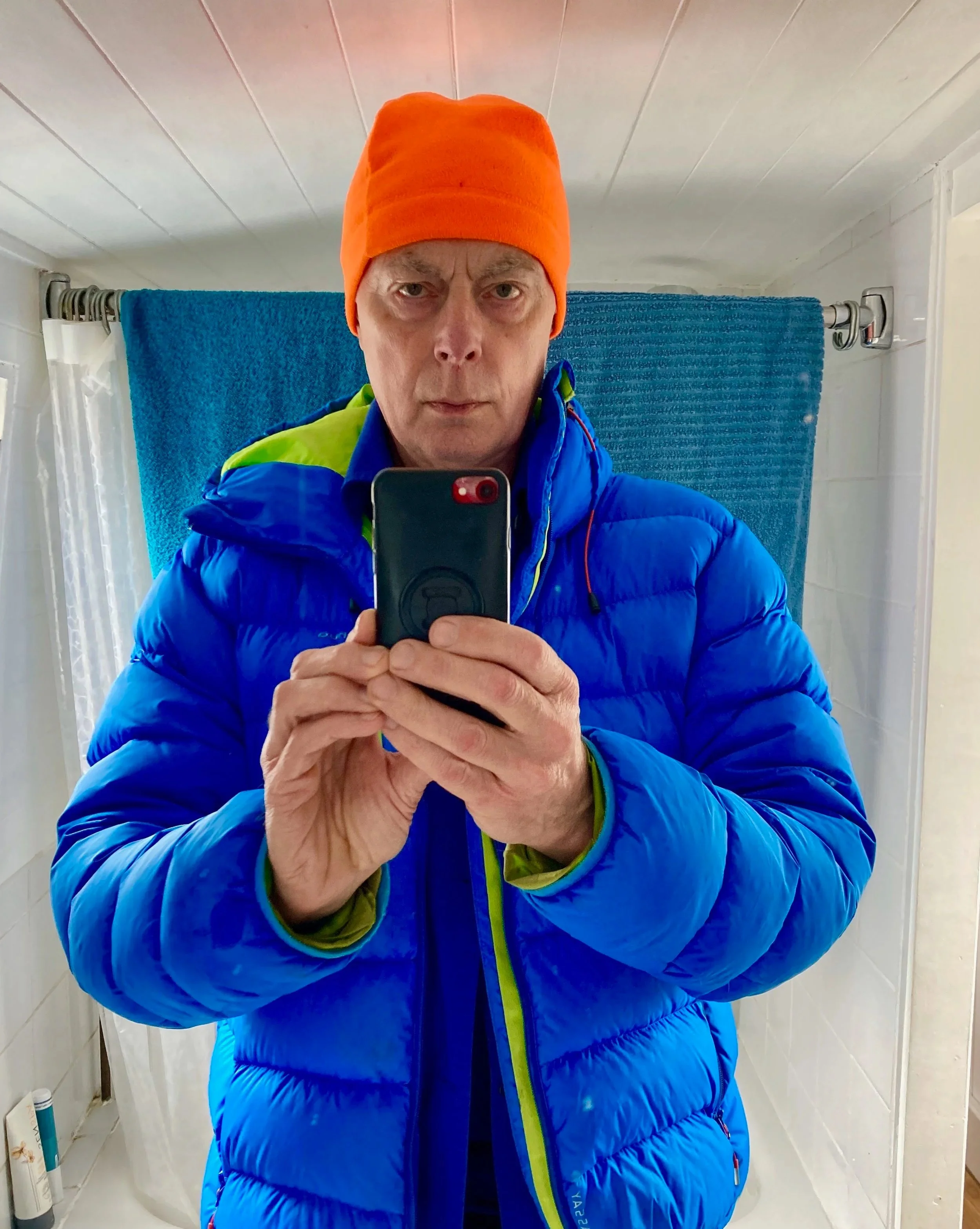 Blue is clearly an important and beautiful colour. It is the colour of a jacket I own and is offset by the vibrant orange hat, in this picture from the bathroom. A limited edition work: Blue 3, Orange 1, Green 1.