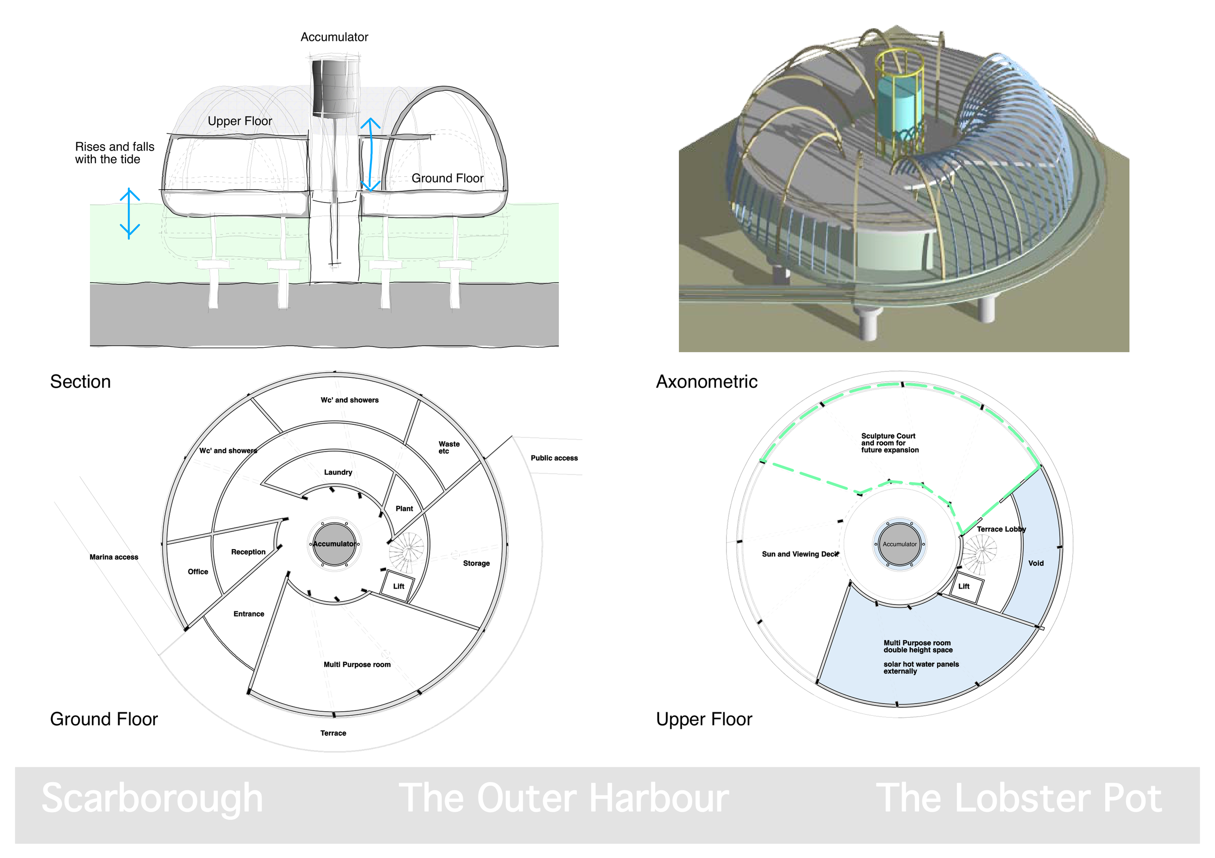 On a few occasions, the opportunity to think about a bridge has come my way. These are two designs. One is the Fish Bridge, conceived with Johnathan Dransfield during the Heartlands Project in Cornwall. It was a response to a competition for a lifting bridge in Scarborough. The other, the Turbine Bridge, or Electric Bridge, emerged from discussions with Ove Arup about the Solway Firth. I thought it might be fun (and instructive) to combine a bridge with turbines, which is why it's called the Electric Bridge.