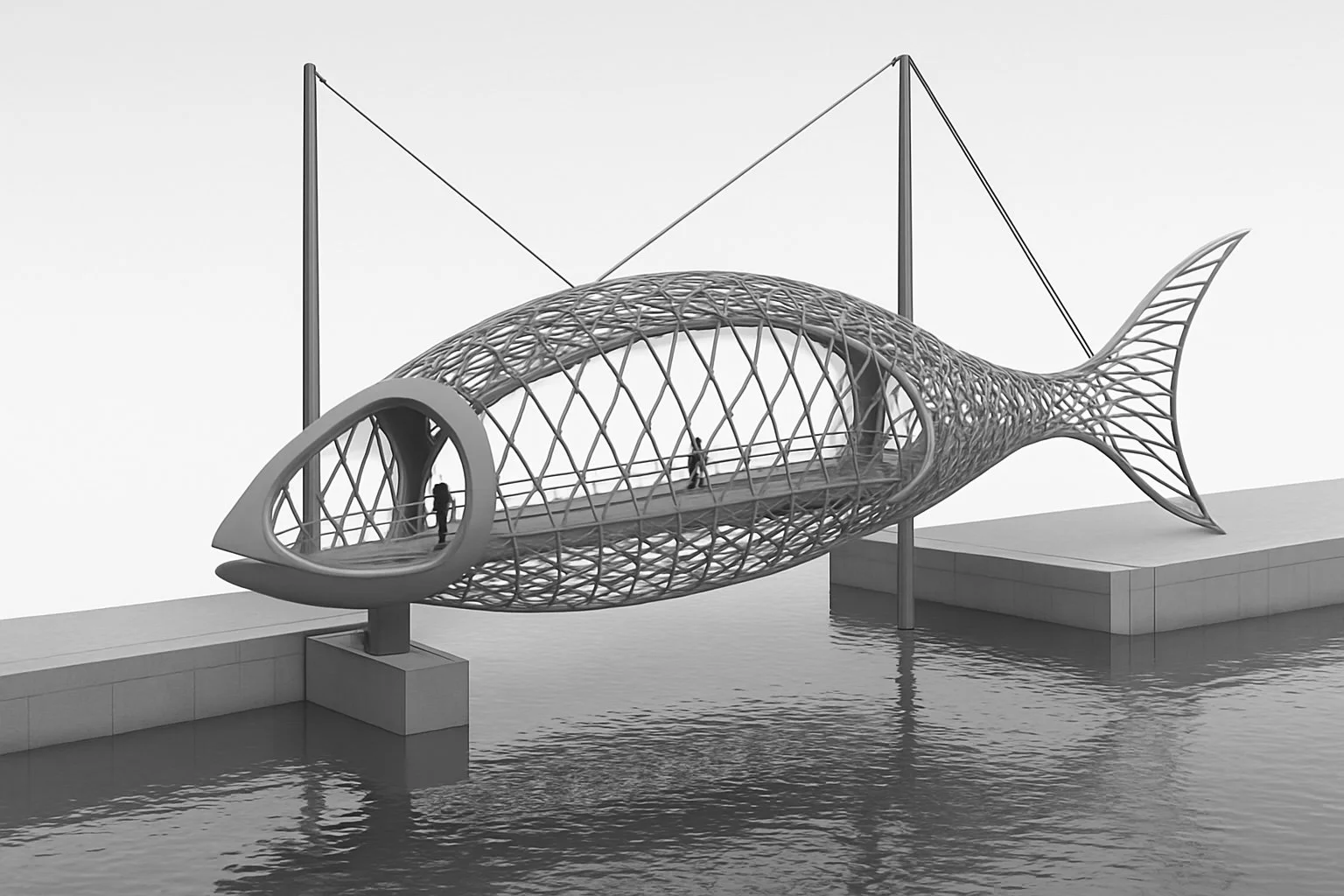 The recent AI renderings are not entirely accurate, but if you compare the sketches with the original CAD drawings, you will see that the Fish Bridge is a cable-stayed structure. It lifts using a powered system, with a water accumulator housed within the onshore visitor centre. The same method was used for Tower Bridge in London and the Albert Dock in Liverpool. A jelly mould inspired the form; you can just make out the edge of this green element. As shown, people can walk through the fish, entering at the tail and exiting at the mouth, or vice versa. The lifting mechanism is a long, fishing-rod-shaped arm, with a hook that engages in the fish’s mouth—something that may not be obvious in the image.