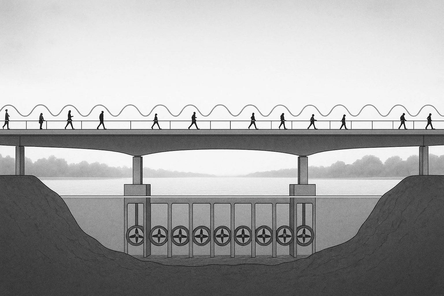 The Turbine Bridge (or “Electric Bridge”) is, in most respects, a conventional piece of engineering. However, I did consider making it fully floating, subject to the tidal conditions in the Solway Firth. Look closely at the image, and you will also notice the footings of a former railway crossing of the inner Solway: the Solway Viaduct of the Solway Junction Railway, which ran between Bowness-on-Solway (Cumbria) and the Annan/Kirtlebridge area (Dumfries & Galloway). It opened for mineral traffic in September 1869, later carried passengers, closed to traffic in 1921, and was dismantled in the mid-1930s, although shoreline remnants are still visible.